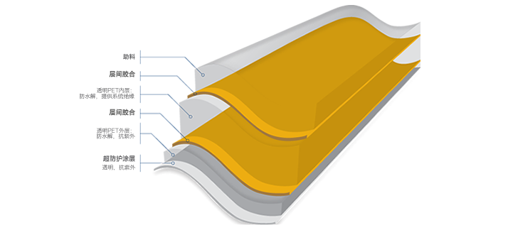 透明的层压基于两层高性能的聚酯薄膜。特别适用于BIPV(光伏建筑一体化),比如温室,停车场等
